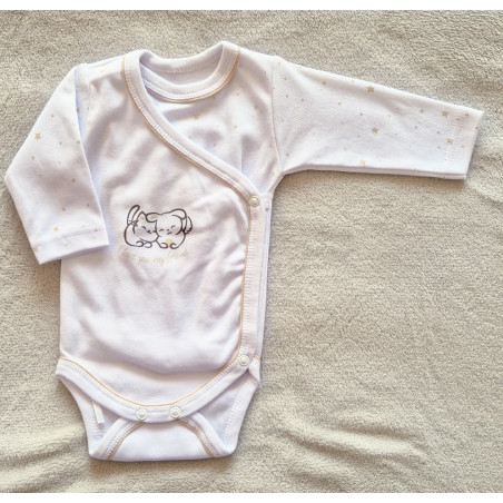 Bavlněné kojenecké body s dlouhým rukávem. Body je bílé, má světle hnědé hvězdičky a obrázek pejska a kočičky.