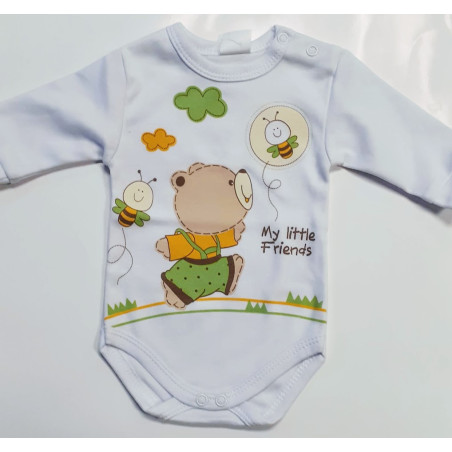 Barvy použité k potisku jsou certifikované a vhodné pro miminka. Je vyrobeno z příjemného a kvalitního materiálu. Body má zapínáni na cvočky na ramínku a mezi nožičkami, což usnadňuje oblékání a přebalování.