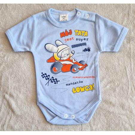 Dětské body s krátkým rukávem, velikost 62 (3-6 měsíců). S obrázkem "MŮJ TÁTA JE SUPER ŘIDIČ" (nápis v polštině).