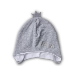 Krásná bavlněná čepice pro holčičku. Na temeni hlavy je šedá koruna. Zavazování pod bradou na šňůrky. Stříbrnou nití je na přední straně vyšitý nápis "PRINCESS".