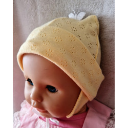 Bavlněná čepička s uzlíkem. Velikost se dá upravit právě pomocí uzlíku. Čepička má vyšitou aplikaci medvídka se srdíčkem.