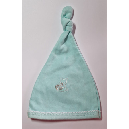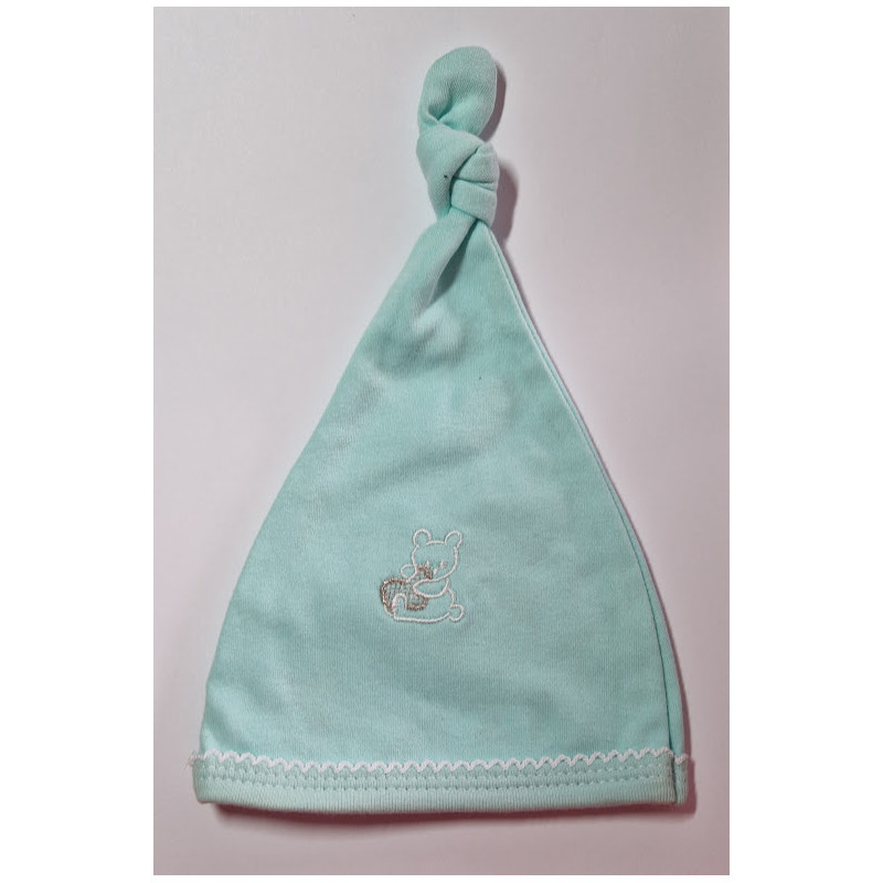 Bavlněná čepička s uzlíkem. Velikost se dá upravit právě pomocí uzlíku. Čepička má vyšitou aplikaci medvídka se srdíčkem.