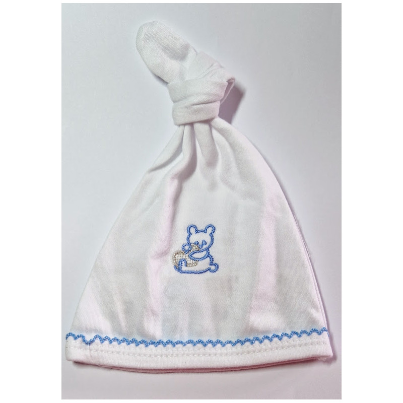 Bavlněná čepička s uzlíkem. Velikost se dá upravit právě pomocí uzlíku. Čepička má vyšitou aplikaci medvídka se srdíčkem.