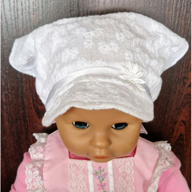 Bavlněný šátek s kšiltem. V zadní části má všitý pásek pružného úpletu, který dovolí přizpůsobení obvodu až o 4 cm.
