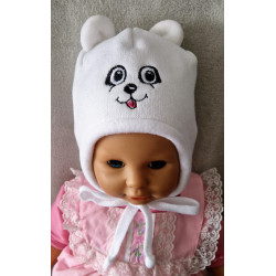 Dětská zimní čepice se šňůrkami na prodloužených ouškách. Obličej pejska je vyšitý. Vrchní vrstva-jemná teplá pletenina, podšitá Polar-fleecem. V podšívce je vypuštěný střední šev a je nahrazen dvěma plochými švy po stranách. Toto řešení zajišťuje, že čepička nezpůsobuje otlaky ležícím dětem.