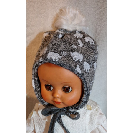Dětská zimní čepice s bambulkou. Potisk - lední medvědi a lišky. Dvouvrstvé provedení a šňůrky. Materiál: 100% polyester .