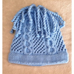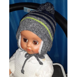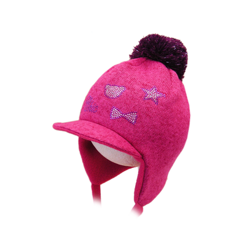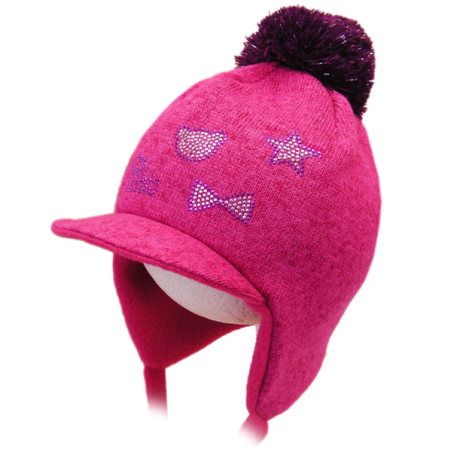Dívčí čepice (zimní kšiltovka) z jemné svetroviny podšitá polarem. Aplikace stříbrných kamínků. Model je zdoben bambulí s třpytivým vlasem a opatřen šňůrkami. Materiál: 100% polyester