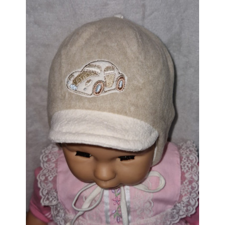 Teplejší čepička s kšiltem, má podšití bavlněnou látkou. Zavazování na šňůrky. Na přední části vyšívané autíčko.