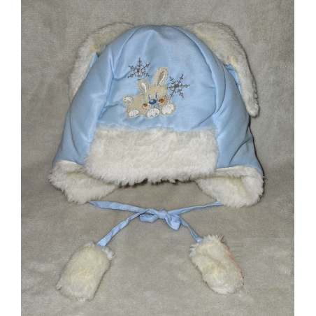 Teplá zimní čepice na zavazování. Nahoře má ouška ve tvaru zaječích uší, vepředu obrázek zajíčka s vločkami. Na koncích šňůrek jsou zaječí pacičky, samozřejmě jako imitace z umělé kožešinky.