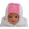 Čepička je bílá, přes střed je tmavě růžový pás, na kterém jsou vyšití dva medvídci.