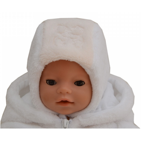 Čepička je bílá, přes střed je béžový pás, na kterém jsou vyšití dva medvídci.