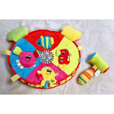 Plyšová vkládačka - třídič tvarů i s plyšovým kladívkem. Uvnitř chrastítko a po stranách šustící uši.