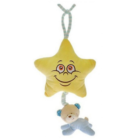Veselá plyšová hvězdička s roztomilým medvídkem. Uvnitř hvězdičky je mechanický hrací strojek, který se aktivuje zatažením za šňůrku s medvídkem.