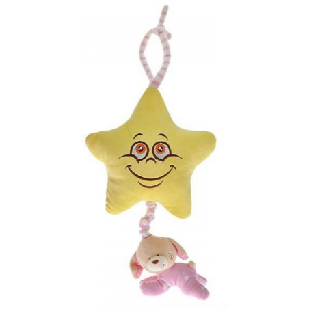 Veselá plyšová hvězdička s roztomilým medvídkem. Uvnitř hvězdičky je mechanický hrací strojek, který se aktivuje zatažením za šňůrku s medvídkem.