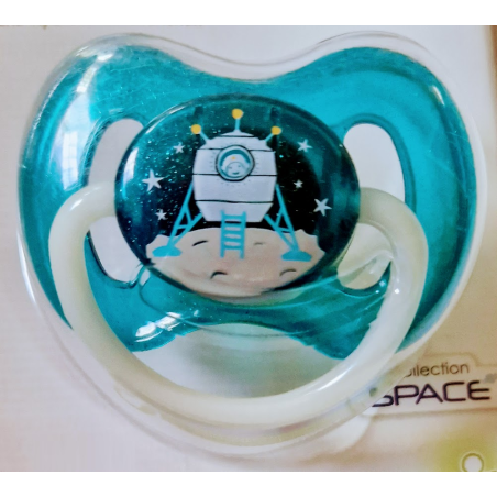 Dudlík s gumičkou kulatého tvaru s potiskem RAKETY.