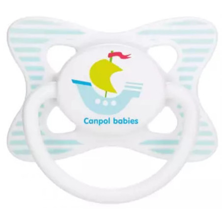 Dudlík s gumičkou kulatého tvaru s potiskem lodičky.