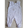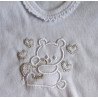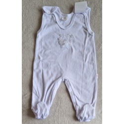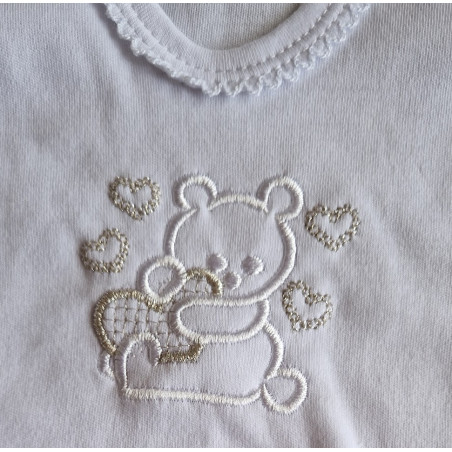 - dupačky: mají na ramínkách a mezi nožkami zapínání na cvočky. Na bocích jsou volně šité a dole mají šlapky. Na předním díle je vyšívaný obrázek bílého medvídka a stříbrnou nitkou vyšívaná srdíčka.