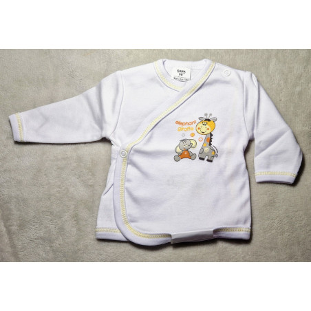 Novorozenecká bavlněná bílá košilka s obrázkem kamarádů sloníka a žirafy, žluté lemování, na ramínku a na boku zapínání na baby druk, na boku uvnitř zapínání na jeden druk. Dvojitá látka na předním díle výborně ochrání citlivé bříško miminka. Materiál: 100% bavlna