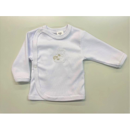 Novorozenecká bavlněná bílá košilka s bílou výšivkou medvídka, bílé lemování, na ramínku a na boku zapínání na baby druk, uvnitř na boku zapínání na druk. Dvojitá látka na předním díle výborně ochrání citlivé bříško miminka. Materiál: 100% bavlna