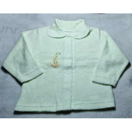 Kojenecká košilka, froté kabátek pro miminko, vel. 74. Je je vyrobena z tenkého, jemného froté materiálu. Kabátek má zapínání na baby druky. Límeček a rukávky jsou lemované bílou obnitkou. Na zelené košilce je vyšitá žlutá kotva.
