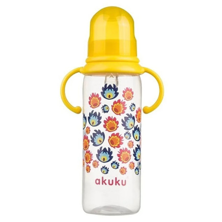Kojenecká láhev s úchyty typu STANDART 250ml (kód výrobku: A0013) značky Akuku - ŽLUTÉ barevné provedení: láhev typu "STANDART" - láhev se standartním tj. klasickým "úzkým" hrdlem, osazena savičkou s pomalým průtokem - určeným dětem 0m+