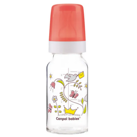 Skleněná kojenecká láhev s potiskem o objemu 120 ml - ČERVENÁ barva. Vyrobená z varného skla, hlavní výhody skleněných lahví - lépe udržují teplotu pití/pokrmu než plastové (sklo má lepší tepelnou vodivost), nezabarvují se od pokrmů.