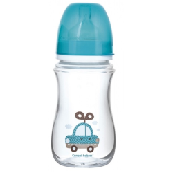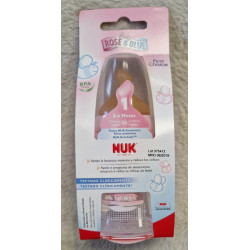 Plastová lahvička NUK 150 ml. Savička s přírodního kaučuku, ortodontický tvar. Na lahvičce je kromě odrázku i měrka od 0 do 150 ml.