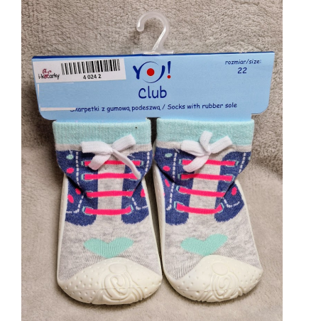 Ponožky s pryžovou podrážkou pro miminka od Yoclub. - gumová podrážka je měkká a elastická, což umožňuje ohýbání chodidel - vpředu je prolamovaná vložka, která zajišťuje lepší cirkulaci vzduchu a činí ponožku vzdušnější