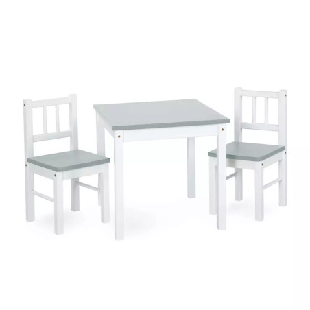 Sestava dětského stolíku a dvou židliček z borovicového dřeva.