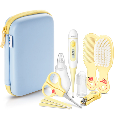 Perfektní jako dárek nebo ideální sada pro začátek, to je sada pro péči o dítě Philips Avent Baby Care Set. Sada obsahuje digitální teploměr, nosní odsávačku s měkkou špičkou, prstový kartáček na zuby a produkty pro péči o nehty a vlasy.