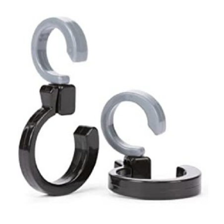 Sada 2 plastových háčků, které se upevňují na rukojeť kočárku. Ideální pro zavěšení tašek, kabelek apod. Otočné o 360°.