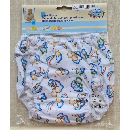 Praktické a pohodlné kalhotky jsou určeny na klasické bavlněné pleny nebo jednorázové plenkové vložky. Kalhotky se zapínají na druky.