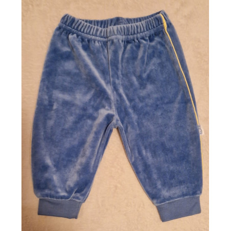 Dětské, teplejší - velurové tepláčky, se žlutým lampasem na boku.