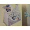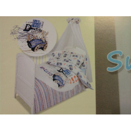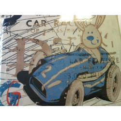 Barevná kombinace: hnědý zajíček v modrém autě, béžový podklad povlečení. Proužky hnědé, modré, černé, červené, béžové.
