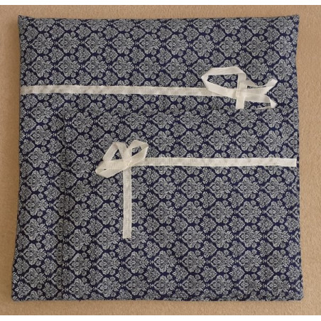 Barva: bavlněná látka s modrotiskem, ozdobená bílou stužkou s mašličkou.