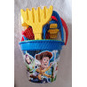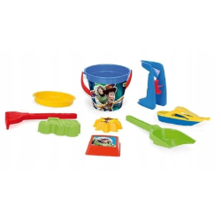 Sada obsahuje: kulaté vědro, lopatku, hrábě, cedník, mlýnek, motorový člun a 3 formičky.