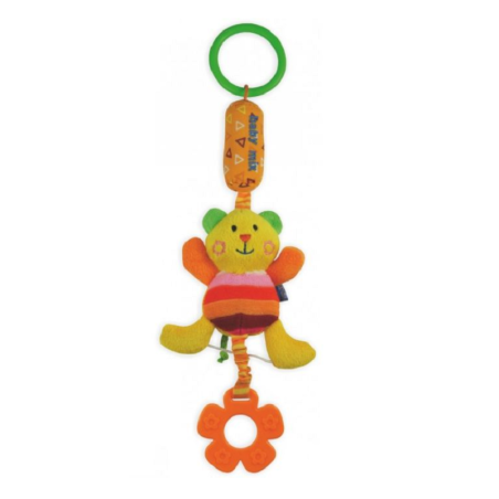 Přívěsek medvídka má kousátko a kroužek na pověšení. Nad sebou má váleček se zvukem zvonečku. Medvídek je vyroben z vysoce kvalitních materiálů a má atraktivní tvary a barvy. Rozvíjí koordinaci ruka-oko u malého dítěte. Zvuky zvonku zabudovaného do hračky vyvolávají v dětech chuť si s ní hrát. Plastový kroužek umožňuje snadné a rychlé připevnění k tyčím vývojové podložky nebo tyči instalované na dětské postýlce, autosedačce nebo kočárku.