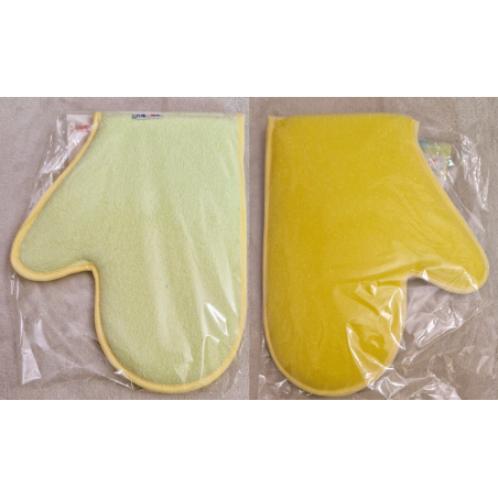 Žínka na koupání, velikost 24 x 20 cm. Barva: 1 strana světle zelená, 2. strana žlutá. Lemovací pásek světle žlutý.