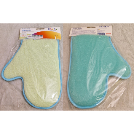 Žínka na koupání, velikost 24 x 20 cm. Barva: 1 strana světle zelená, 2. strana tyrkysová. Lemovací pásek světle modrý.